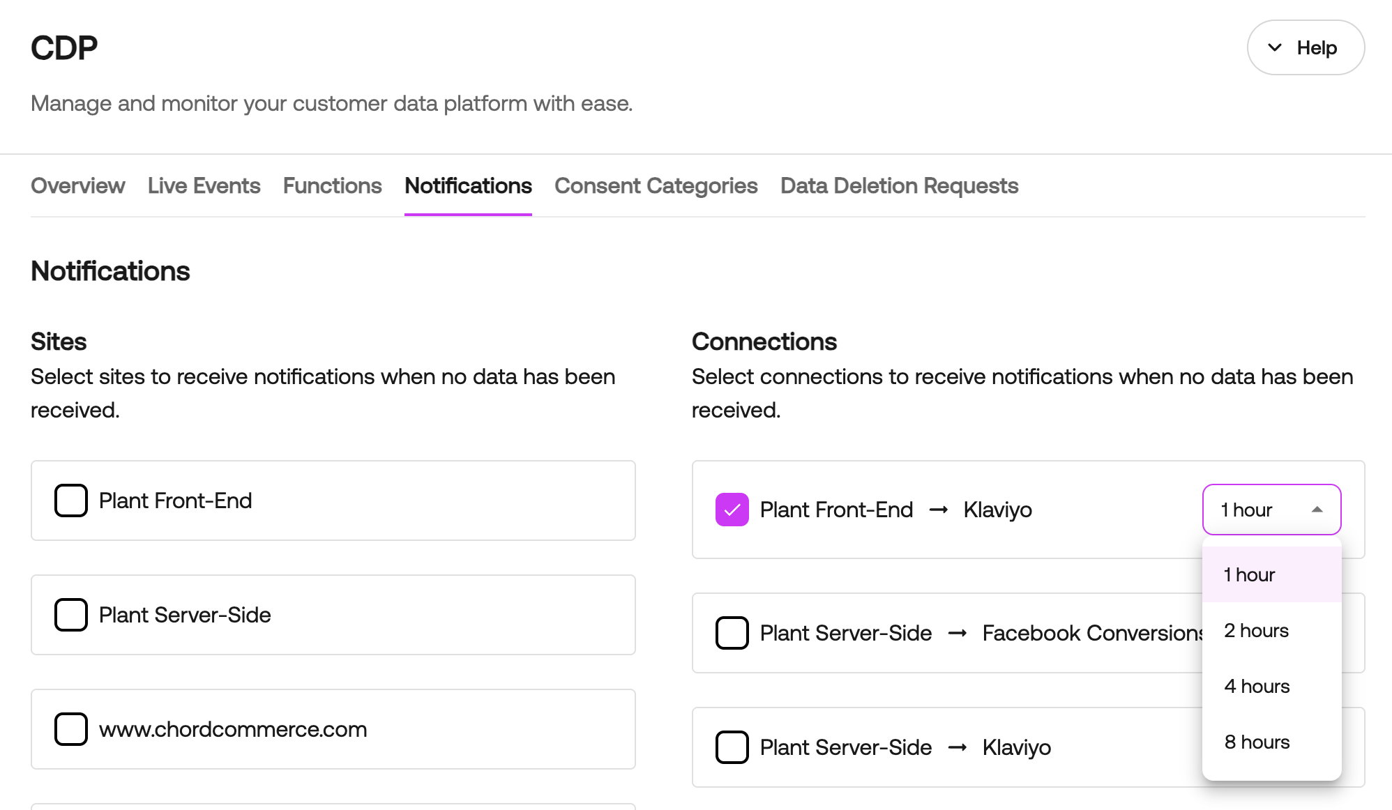 Head to the Notifications tab in the Chord CDP, select the sources or destinations you want to monitor, and choose a threshold window: 1, 2, 4, or 8 hours. If no data is received within that timeframe, Chord will notify you — ensuring timely alerts without overwhelming your inbox.